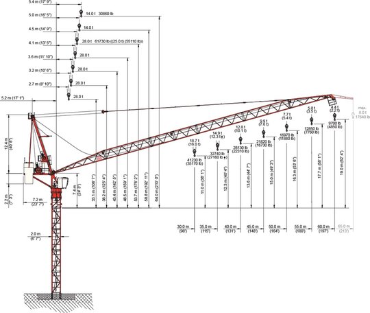 30 m (98′) basic jib. Extensions up to 60 m (197′) radius in 5 m (16′) steps. Towertop with luffing winch. Slewing frame with driver’s cabin, control cabinet, slewing gear, ball race bearing with central lubrication unit and slipring system. Counter-jib with hoisting winch and counterweights.